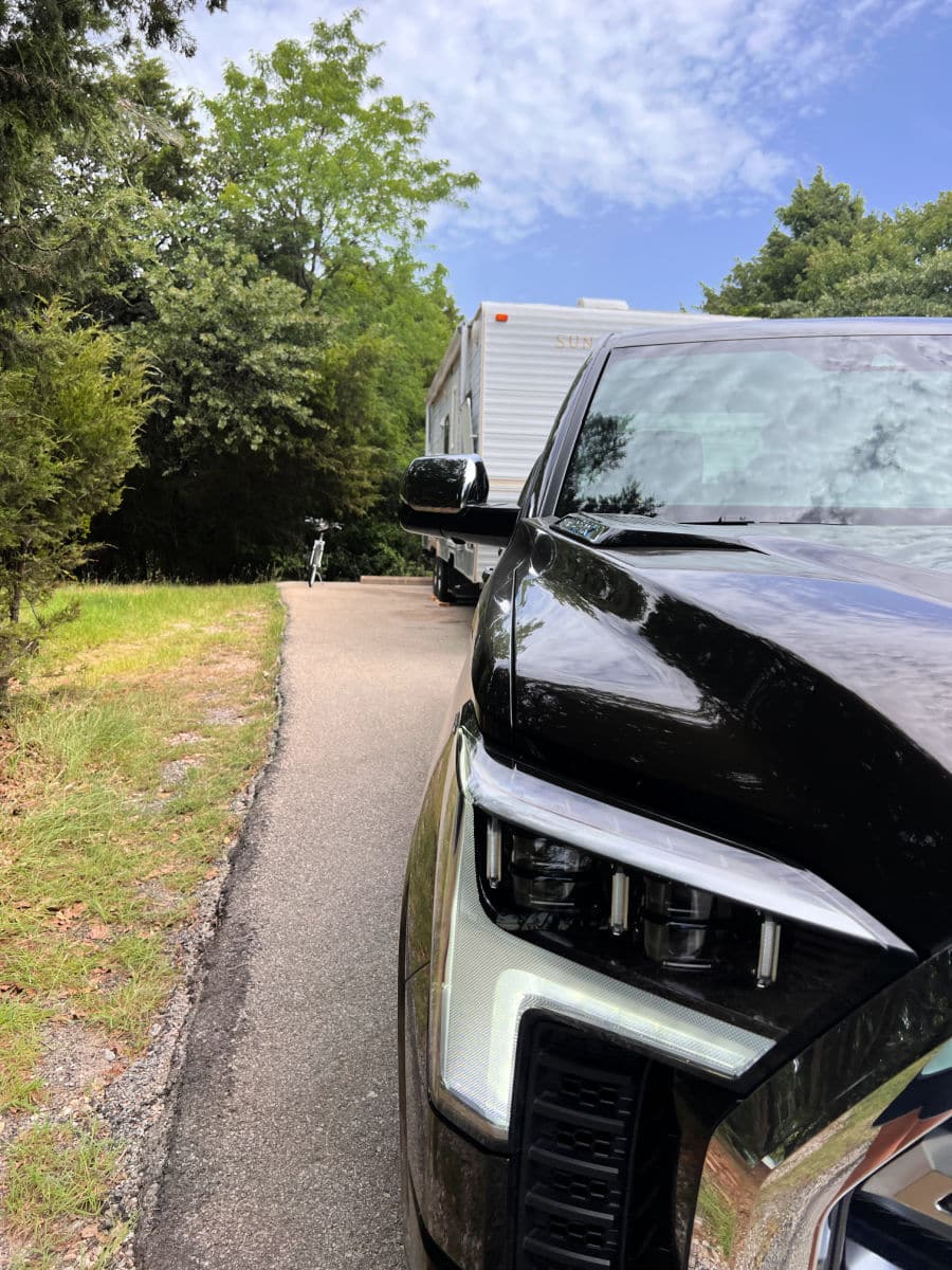 We chose to take a 2022 Toyota Tundra truck to haul the trailer because it has a towing capacity up to 11,175 pounds.
