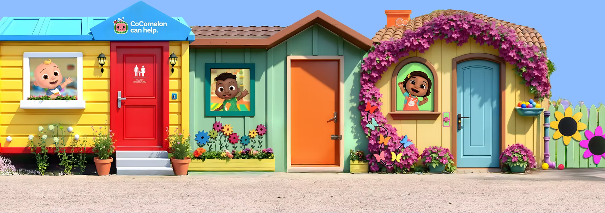 The inclusion of familiar CoComelon characters throughout the space creates continuity between home viewing experiences and public application of learned skills.