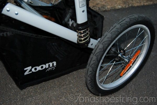 Safety - Always important, check for safety features on the stroller. The Joovy Zoom ATS has a 5-point harness system, with reflective stitching, to keep your child in place. The wheelbase is 25" wide when unfolded and sits on 16" wheels on alloy rims.