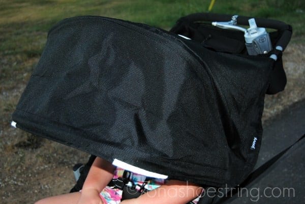 Weatherproof - I was quite excited to find a rain/wind cover in our Joovy Zoom box. It will make our training much easier once the cooler weather moves in and brings a soft breeze off the lake where we walk. Plus, the large, over-sized canopy protects her from the sun while allowing us to see her through the window visor on top.