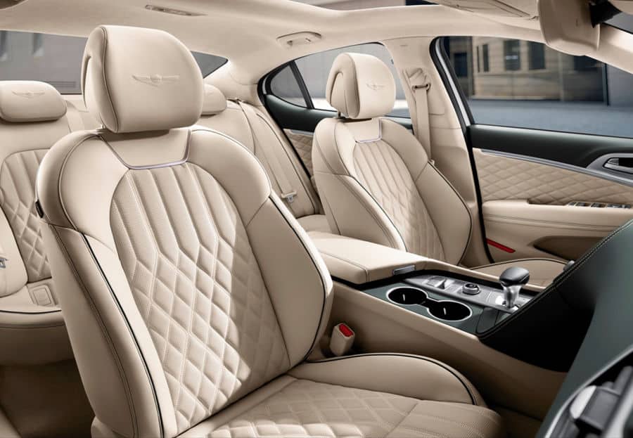 The cabin of the G70 Sport is trimmed with aluminum and features the geometric Sport Pattern that reflects and diffuses light beautifully.